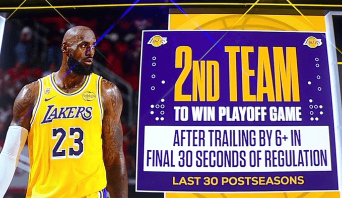 根据数据统计,湖人是近30年第二支在季后赛最后30秒落后6分最后逆转的球队。